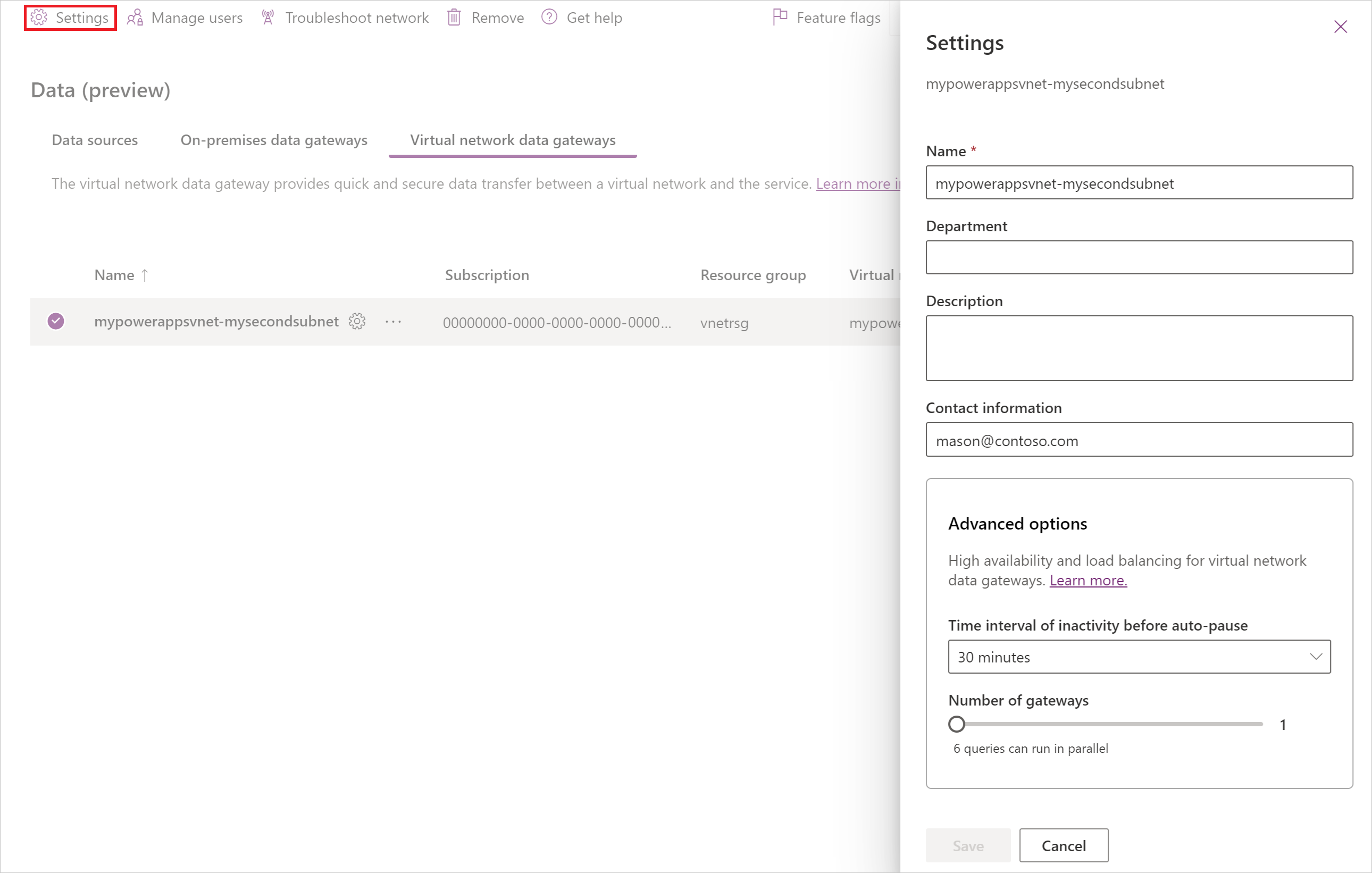 Kedykoľvek môžete zmeniť počet brán v klastri. Pred automatickým pozastavením tiež môžete zmeniť časový interval nečinnosti. Ak chcete tieto nastavenia upraviť, vyberte bránu údajov virtuálnej siete a potom v hornej časti vyberte položku Nastavenia . Teraz môžete zmeniť rozšírené možnosti na paneli Nastavenia .