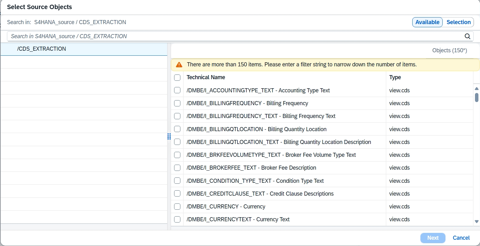 Vyberte vhodný zdrojový kontajner, čo je typ zdrojových objektov, z ktorých chcete replikovať. Nasledujúci príklad používa CDS_EXTRACTION na replikáciu dát z pohľadov CDS v zdrojovom systéme SAP S/4HANA na mieste. Potom vyberte Select.