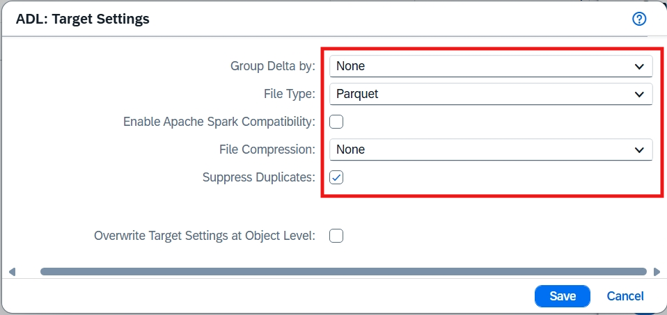 Nastavte cieľový ADLS Gen2. Vyberte cieľové pripojenie a kontajner. Skontrolujte, či sú cieľové nastavenia správne: Zoskupiť Delta je nastavené na Žiadne a typ súboru na Parquet.