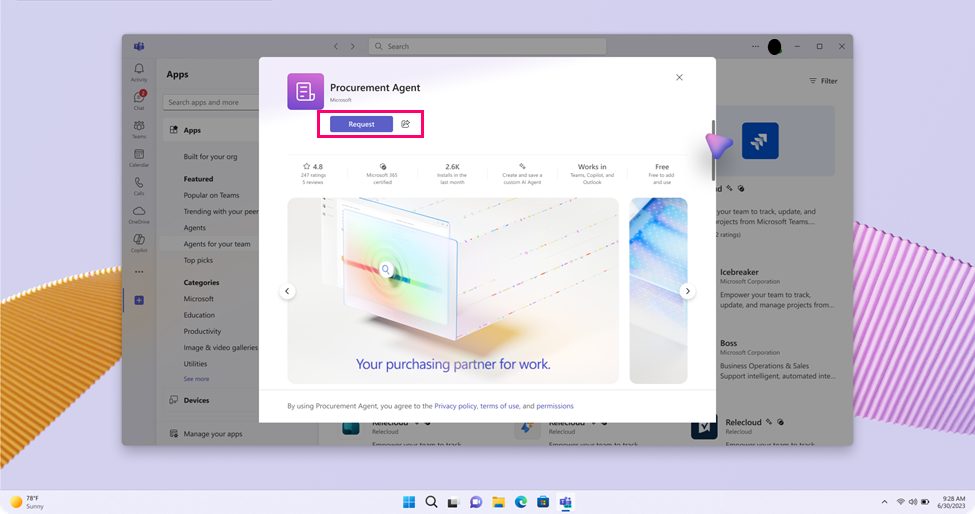 Agent templates are available in the Microsoft 365 Copilot Store under Agents for your team or in the Apps area in Microsoft Teams. All users in the tenant can find and view agent templates.