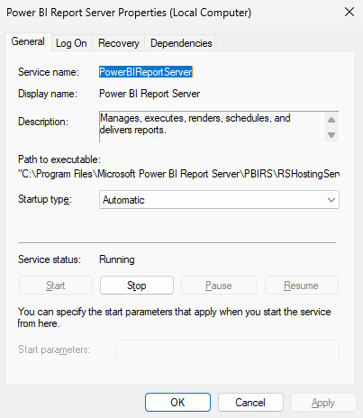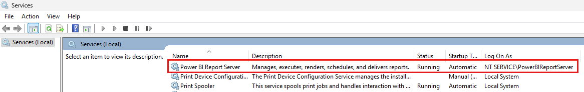Ako súčasť inštalácie sa vytvorí služba Windows. Správca služieb systému Windows ho uvádza ako server zostáv Power BI. Názov služby je PowerBIReportServer.
