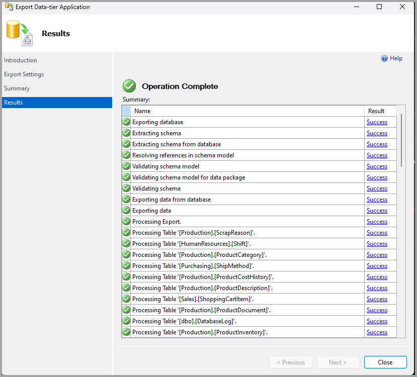 The data-tier application (DAC) export process is related to the DAC extract process. Both export and extract include the database schema in the produced file, but the export process is limited to functionality available in the Azure SQL Database surface area. Learn more from the SqlPackage portability documentation.