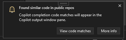 With Visual Studio 2022 version 17.13, code referencing is available for GitHub Copilot Completions. If you or your organization enabled suggestions that match public code, Copilot notifies you when you accept a completion that matches code from a public GitHub repository.