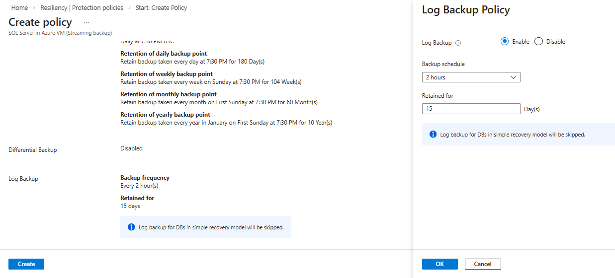 On the Log Backup Policy pane, configure the following settings: