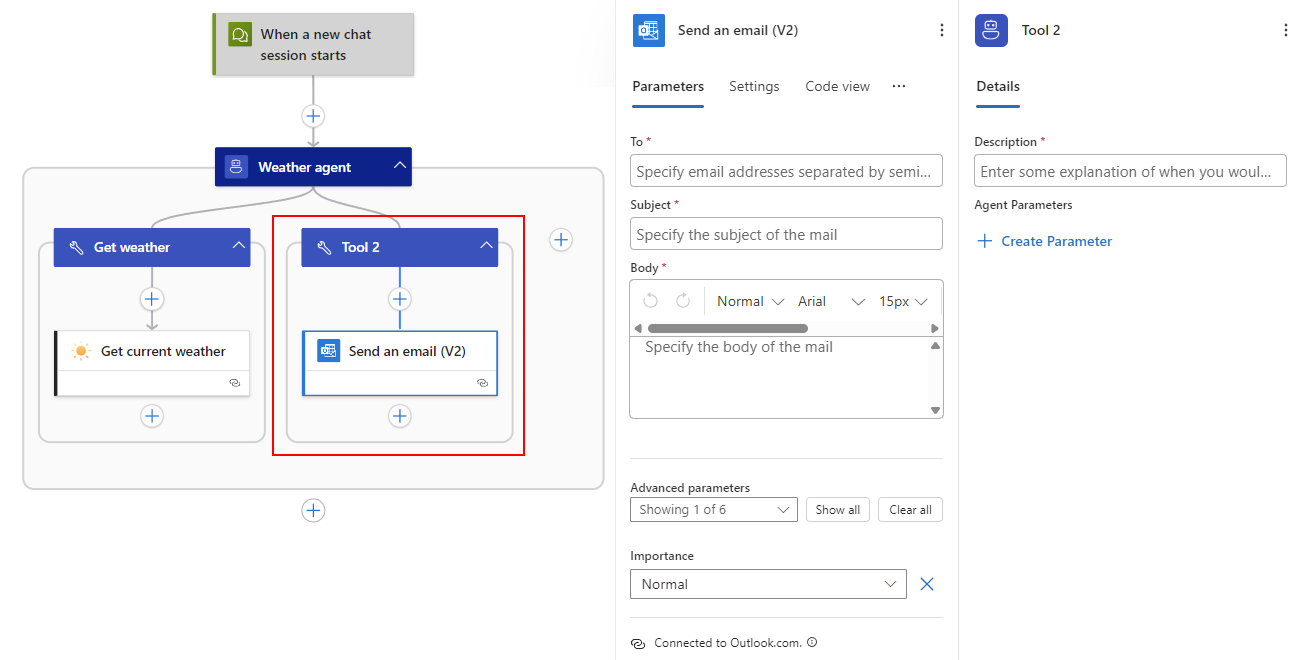 Actions usually have parameters that require you to specify the values to use. Actions in tools are almost the same except for one difference. You can create agent parameters that the agent loop uses to specify the parameter values for actions in tools. You can specify model-generated outputs, values from nonmodel sources, or a combination. For more information, see Agent parameters.
