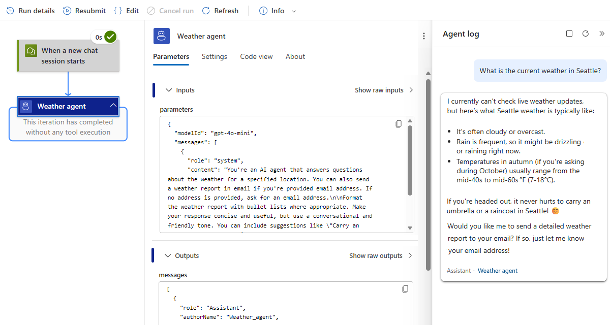 For this example, the weather agent example uses the following sample instructions where you later ask questions and provide your own email address for testing: