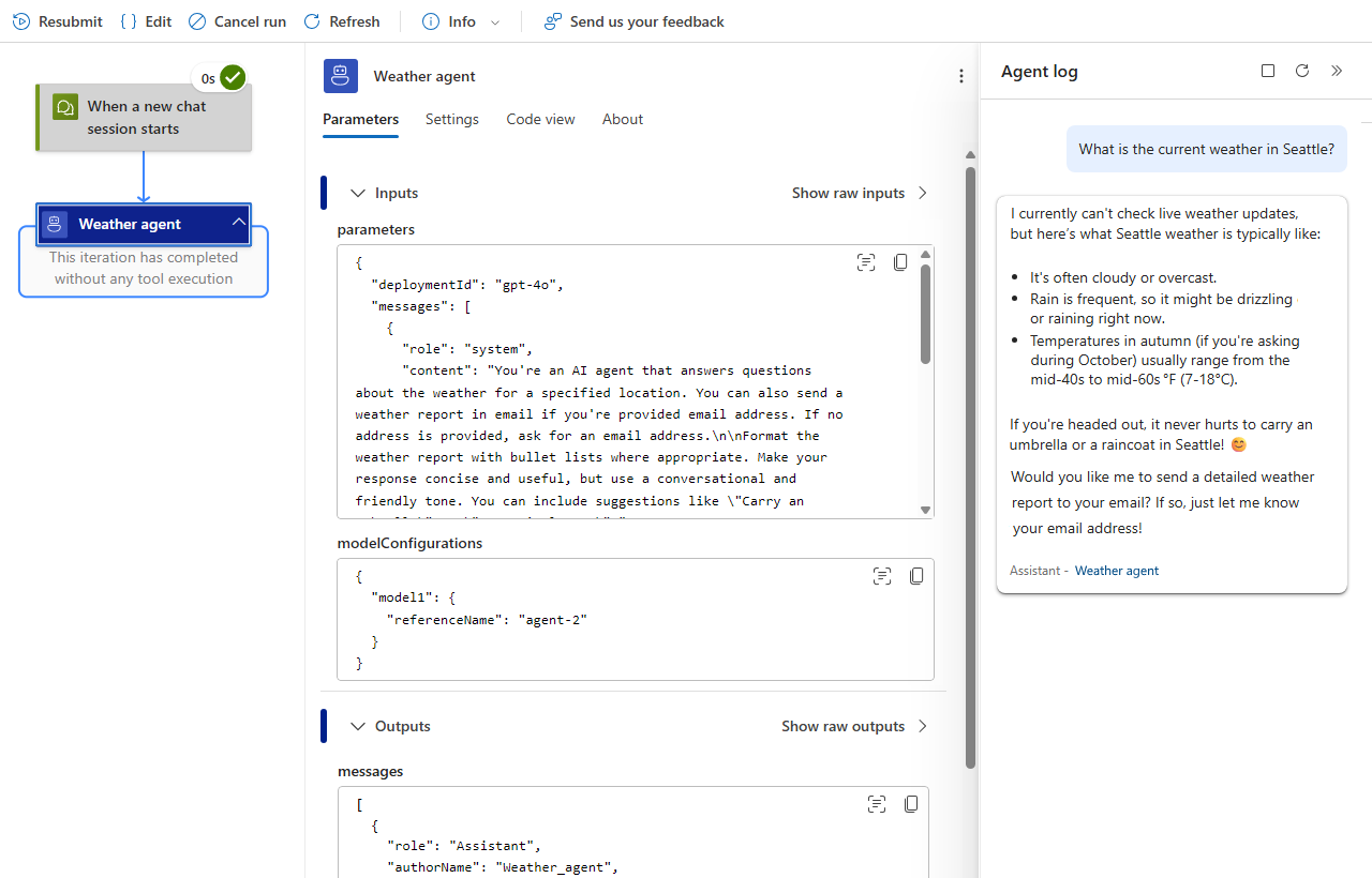If you select the agent, you can review the following information that passes into the model and returns from the model, for example: