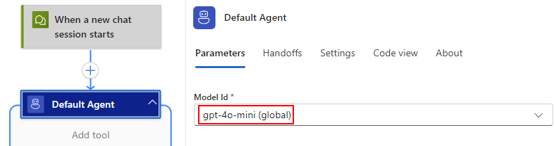 By default, your agent automatically uses the Azure OpenAI model available in your logic app's region. Some regions support gpt-4o-mini, while others support gpt-5o-mini.