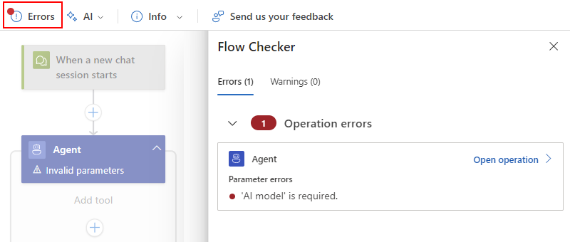 If you try to save the workflow now, the designer toolbar shows a red dot on the Errors button. The designer alerts you to this error condition because the agent loop requires setup before you can save any changes. However, you don't need to set up the agent loop now. You can continue to create your workflow. Just remember to set up the agent loop before you save your workflow.