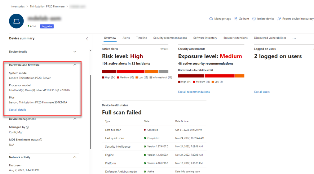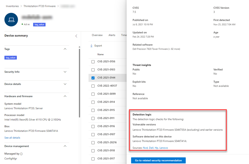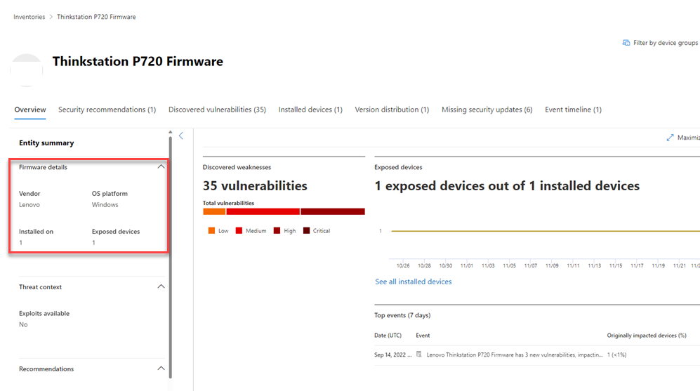 Microsoft Defender Vulnerability Management hardware and firmware assessment provides a list of known hardware and firmware in your organization. It provides individual inventories for system models, processors, and BIOS. Each view includes details such as the name of the vendor, number of weaknesses, threats insights, and the number of exposed devices.