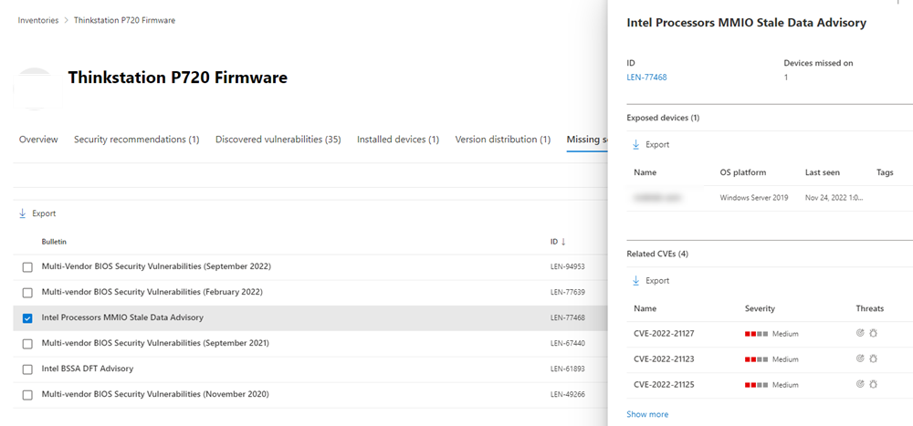 When you select an item from the list, a flyout panel will open with a link to the BIOS vendor advisory, a list of exposed devices, and a list of CVEs.