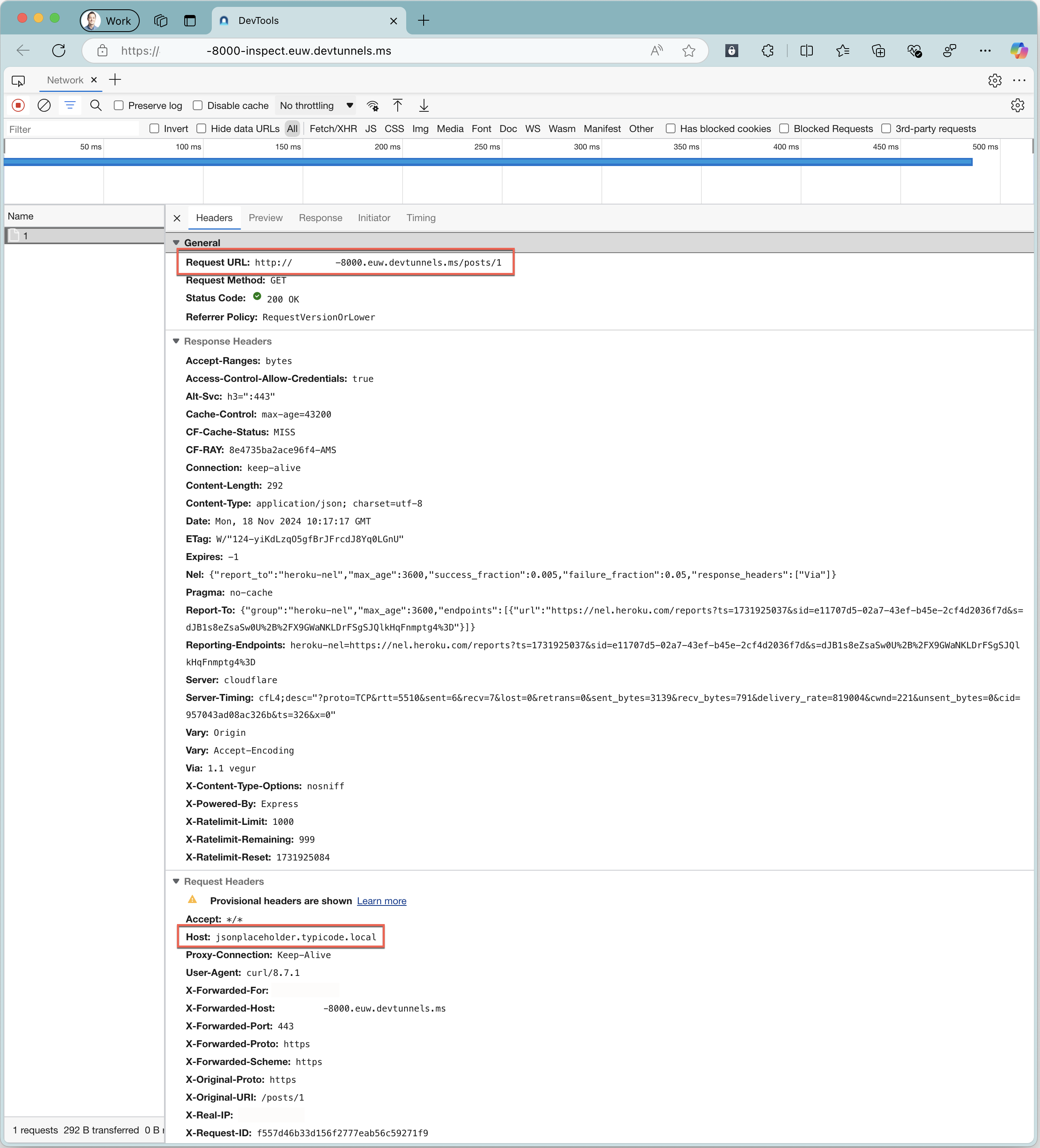 curl https://tunnel_id-8000.euw.devtunnels.ms/posts/1.In the web browser with Chrome Dev Tools, notice the information about the intercepted request and the response from the cloud API.