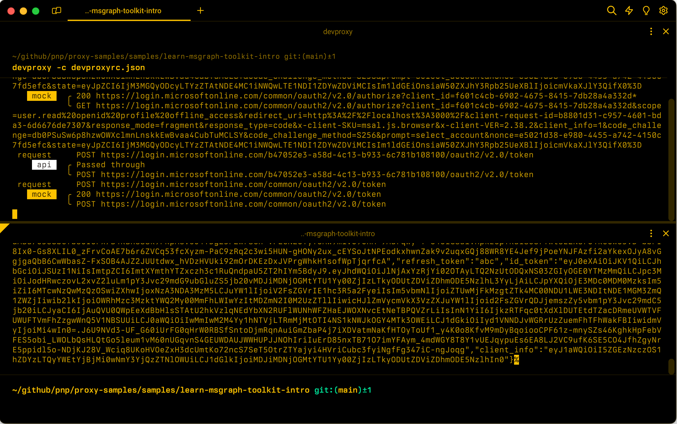 Mocked ID token. Dev Proxy removes the @dynamic. token and updates the value of the nonce claim in the mocked ID token. |