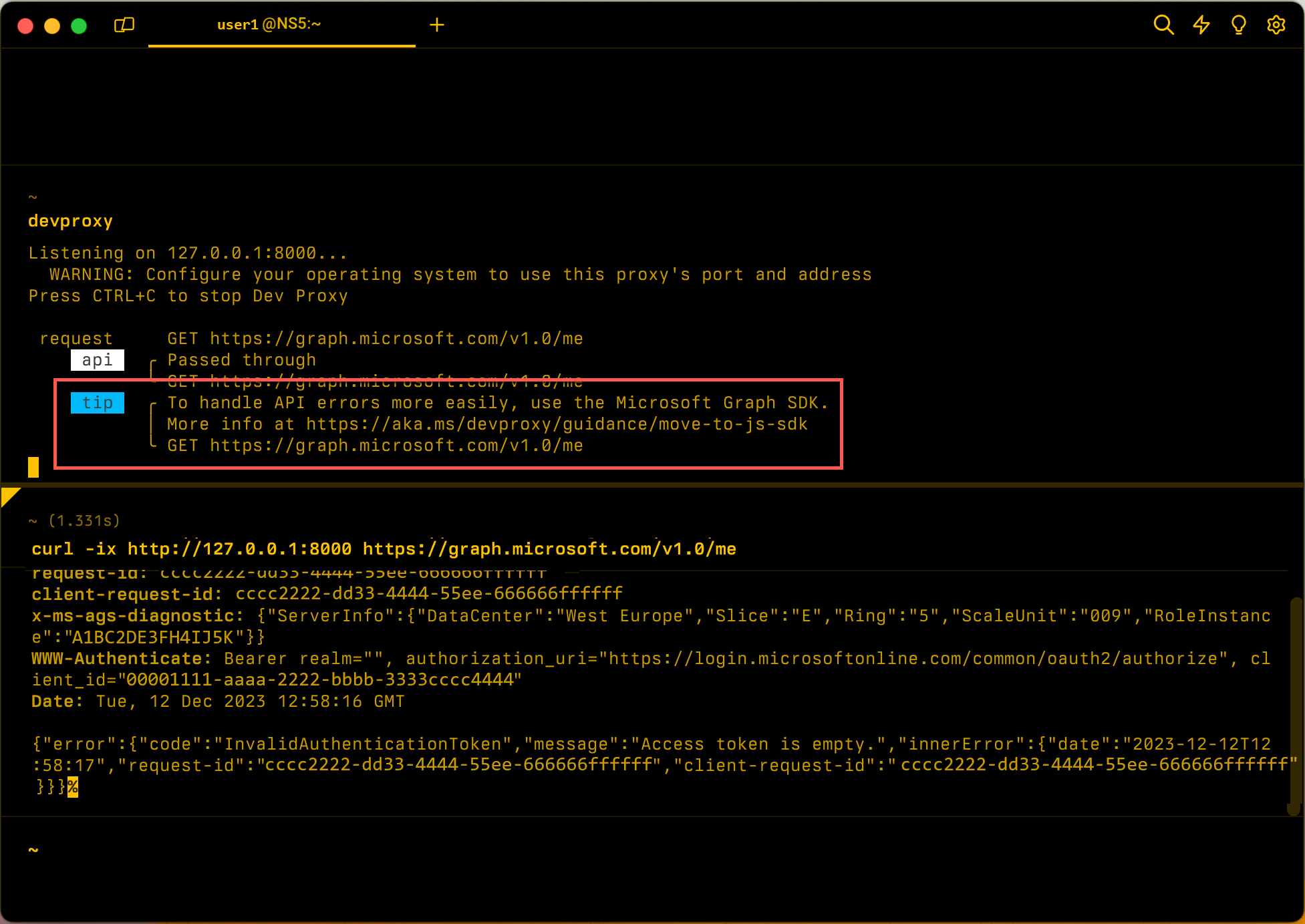 Shows a tip when proxy intercepts a request to Microsoft Graph that hasn't been issued by a Microsoft Graph SDK.