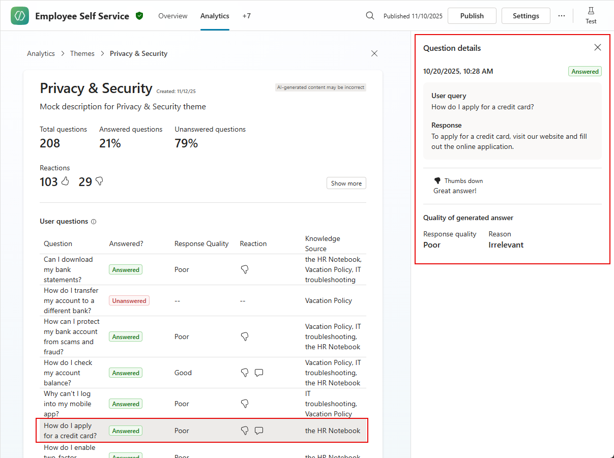 To display a breakdown of the quality of response for a sampling of answered questions, and all referenced knowledge sources in this theme, select See details.