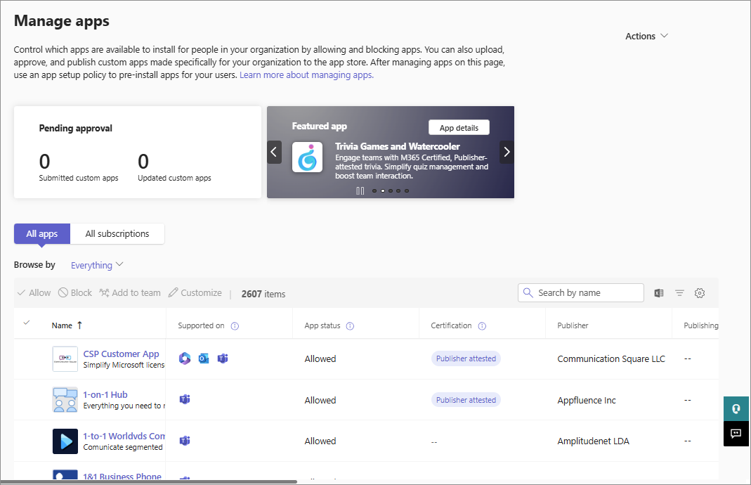 The Teams admin center now includes Apps to consider allowing tile on the Manage apps page. This tile displays counts of Microsoft 365 certified and publisher-attested agents and apps, helping admins quickly identify trusted agents and apps. Select a count to filter the list and simplify management.