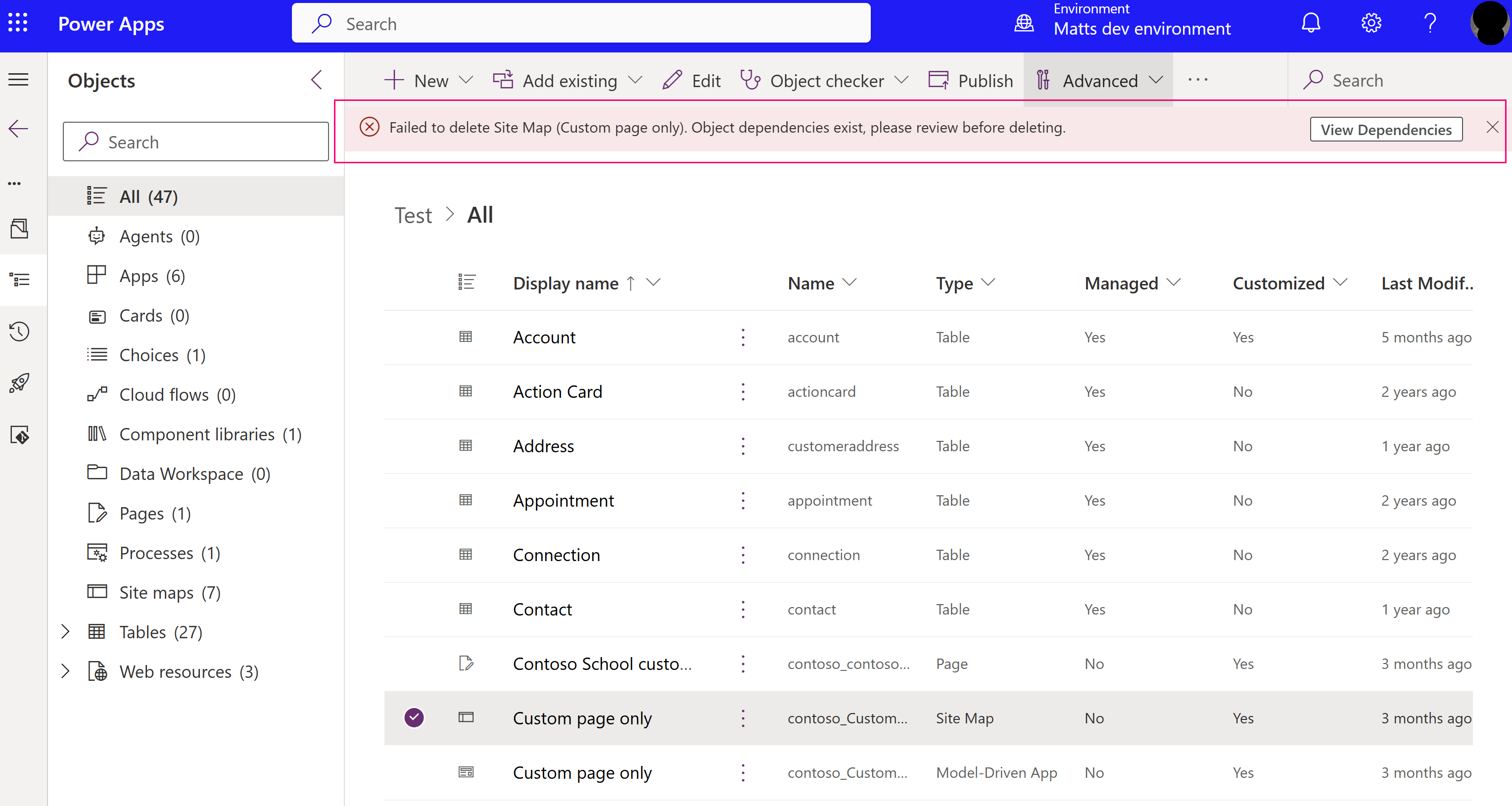 Ustvarjalec okolja se odloči, da ne potrebuje več rešitve - entitete po meri. Izdelovalec ga je poskušal izbrisati in prikazala se mu je naslednja stran: