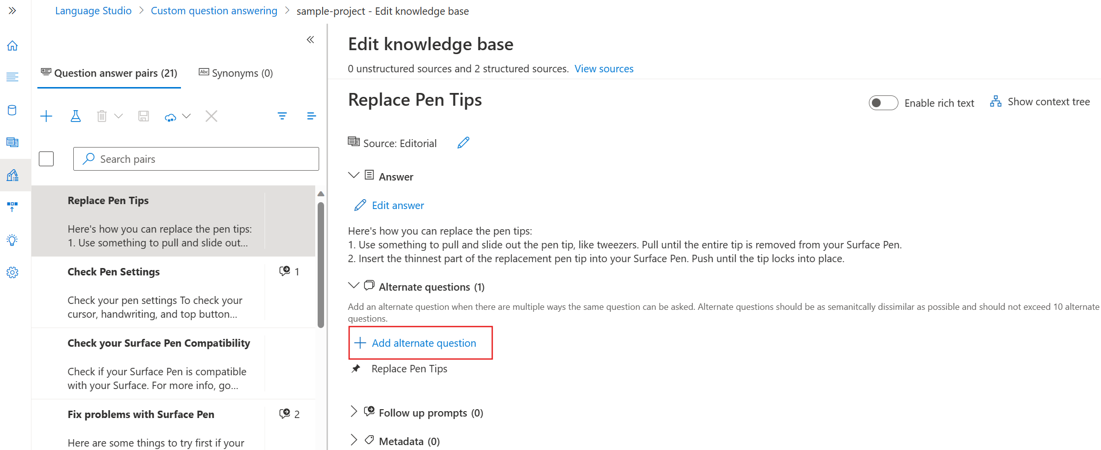 You can also manually add alternate questions when you select Add alternate question for a pair in the Edit knowledge base pane: