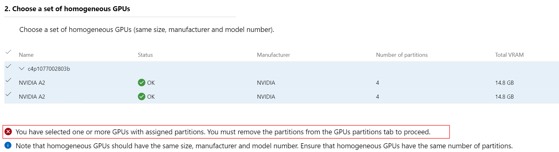 Warning. If not all the GPUs across all the servers have the same configuration, Windows Admin Center gives a warning. You must manually select the GPUs with the same configuration to proceed further.