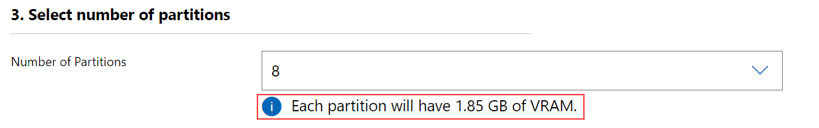 As soon as you select a different partition count, a tooltip appears below the dropdown list, which dynamically displays the size of VRAM that each partition gets. For example, if the total VRAM is 16 GB for 16 partitions in the GPU, changing the partition count from 16 to 8 assigns each partition with 1.85 GB of VRAM.