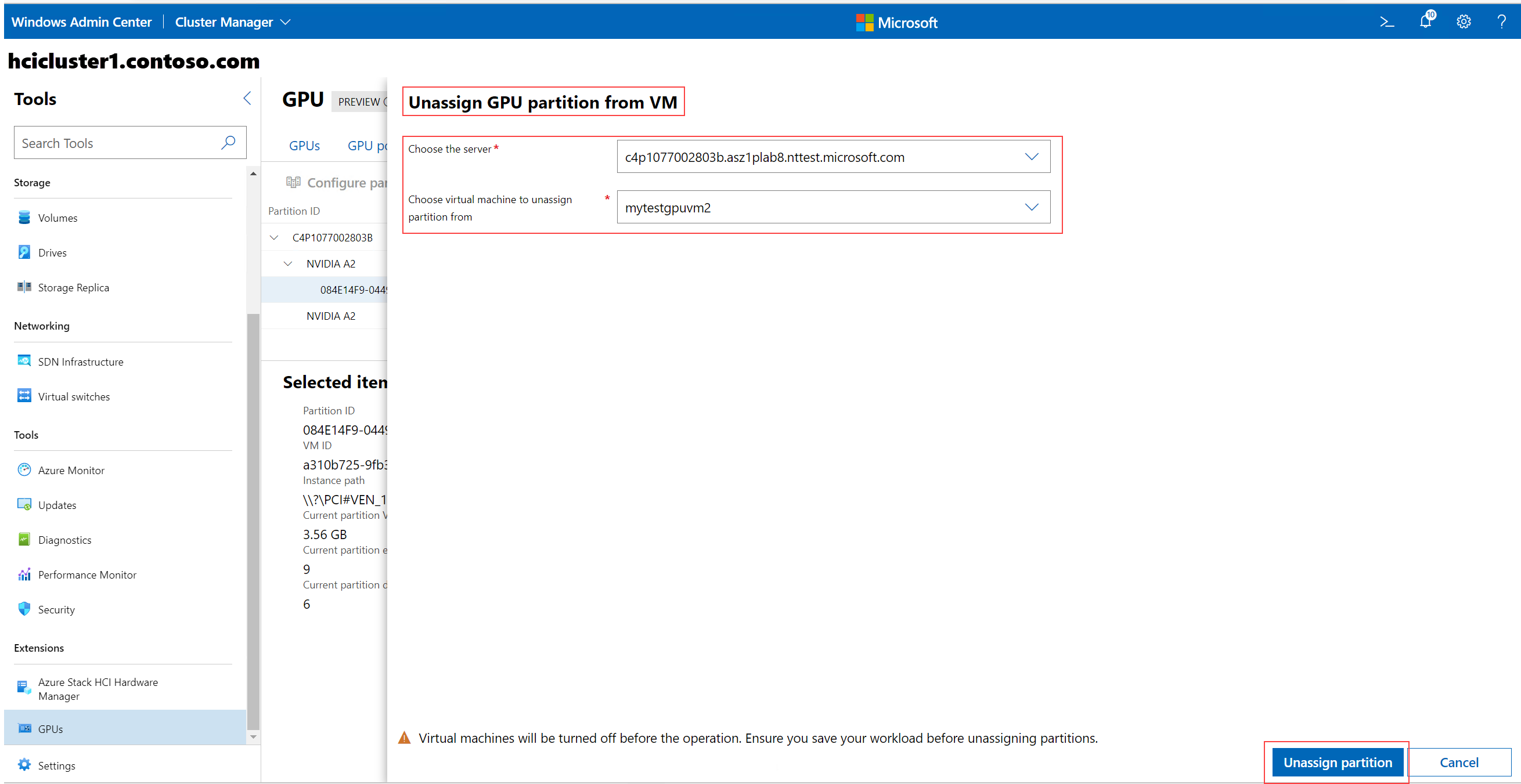 You must save your workloads before assigning partitions. If your VM is currently turned on or running, Windows Admin Center automatically turns it off, assigns the partition, and then automatically turns it on.
