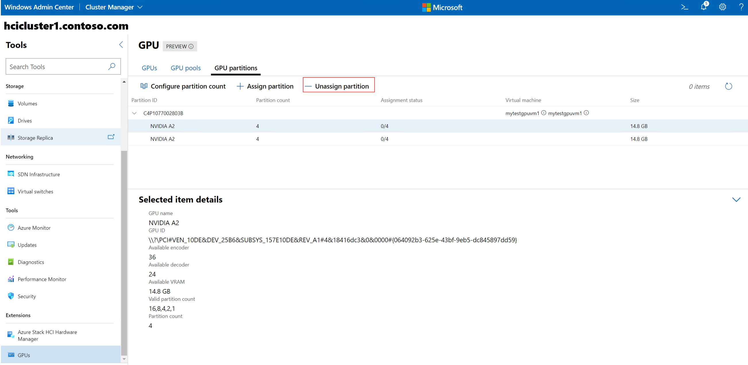 This article describes how to configure graphics processing unit (GPU) partitions and assign a partition to a virtual machine (VM). It provides instructions on how to configure GPU partition count, assign GPU partitions, and unassign GPU partitions via Windows Admin Center and PowerShell.