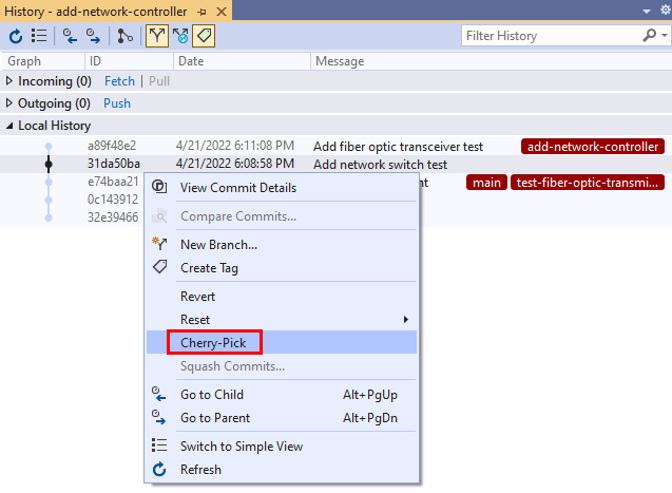 In the History tab, right-click the commit you want to cherry-pick and choose Cherry-Pick. Visual Studio doesn't support cherry-picking more than one commit at a time, so you'll need to repeat this step for each commit that you want to cherry-pick.