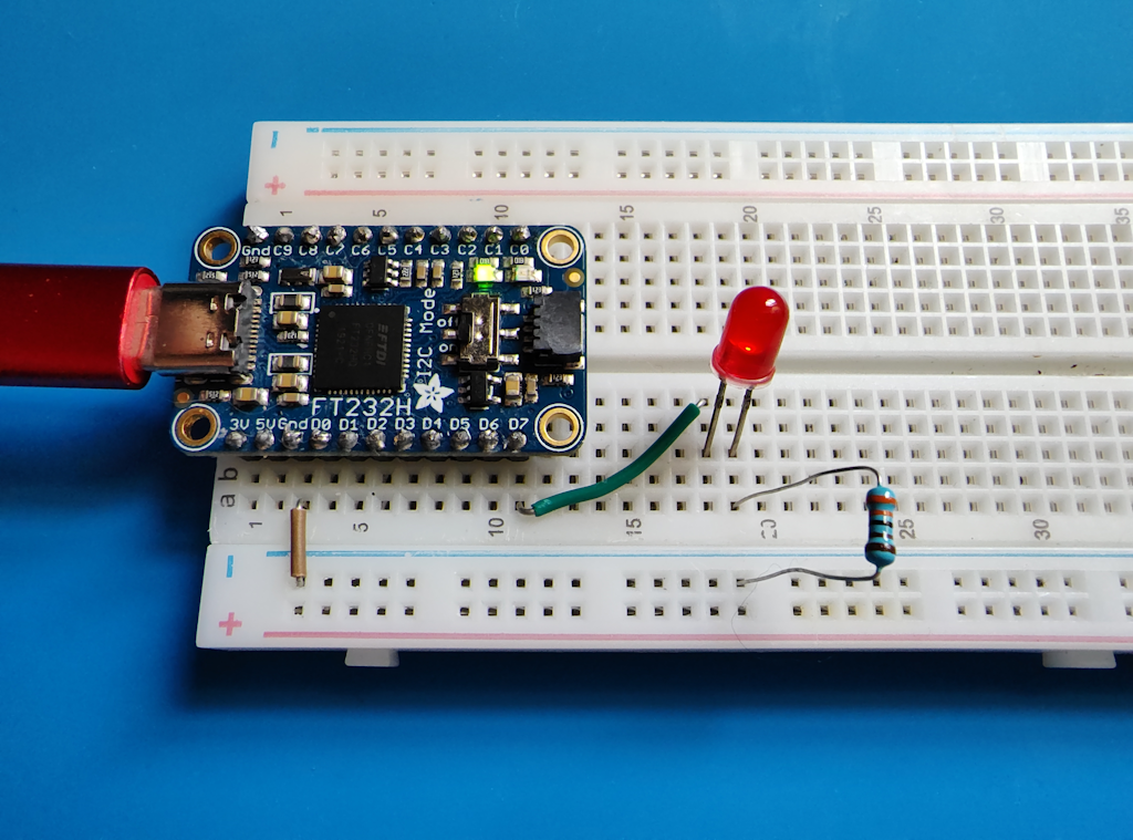 Here's a hardware implementation of the Blink an LED tutorial that uses the FTDI FT232H adapter to control an LED: