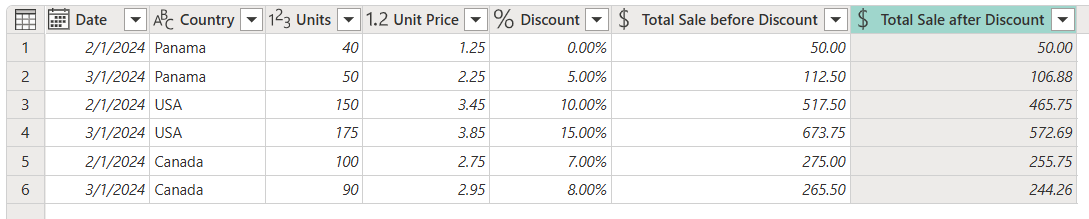 The result of that operation adds a new Total Sale after Discount column to your table.