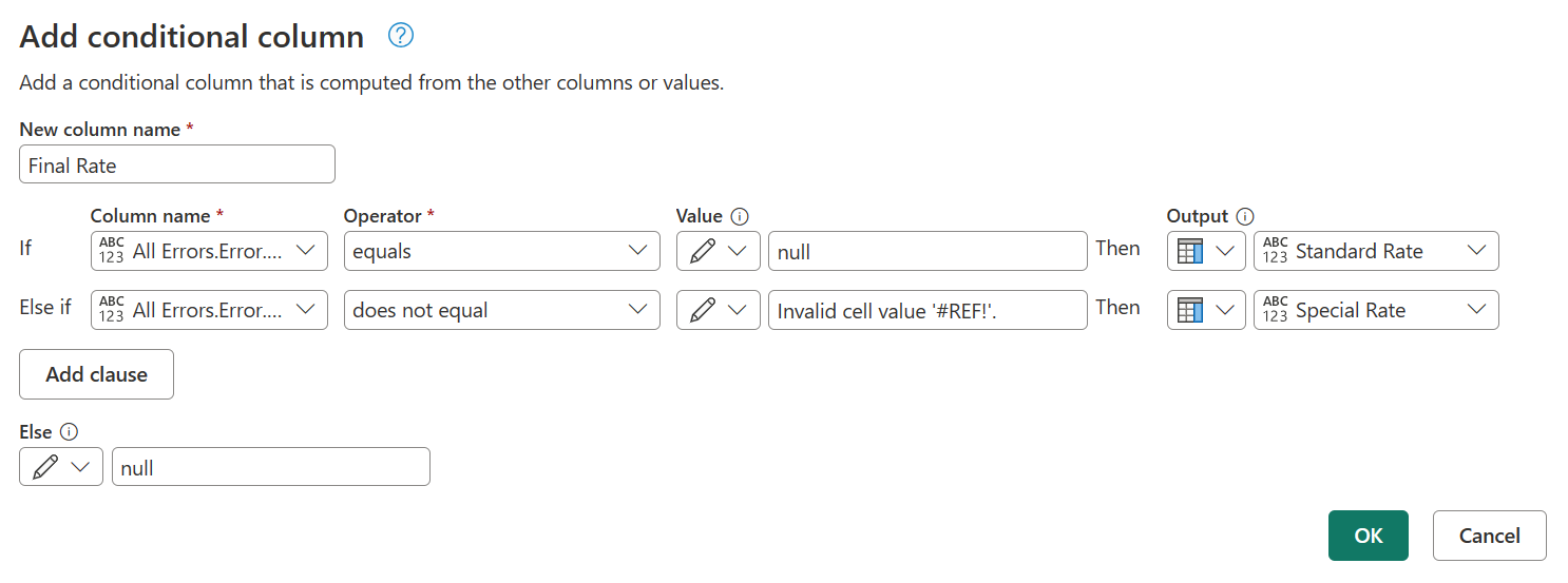 Now with each error message in a new column, you can create a new conditional column with the name Final Rate and the following clauses: