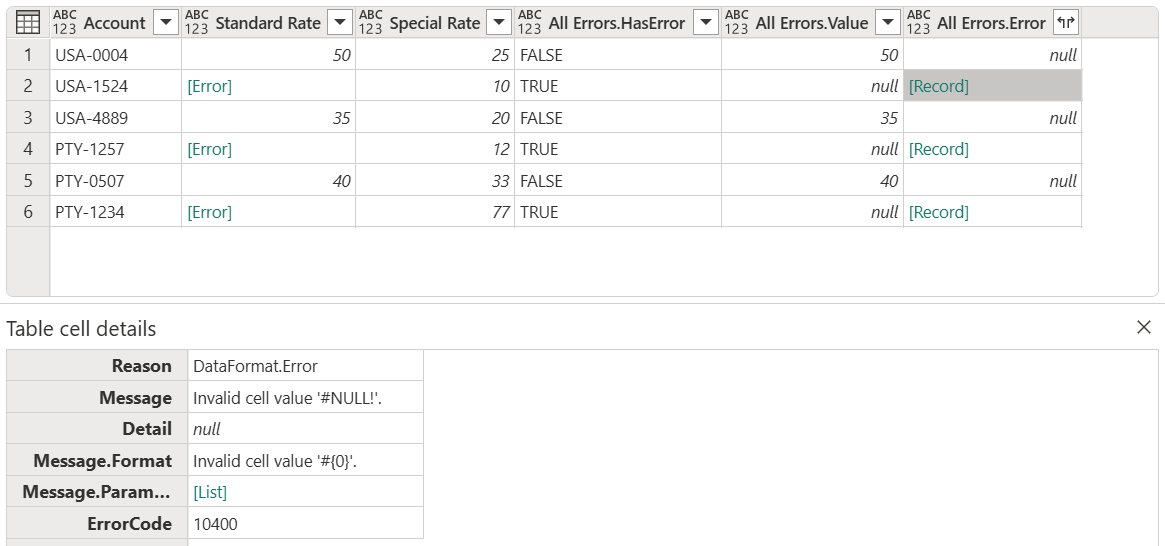 nullvalues. - All Errors.Error—if the value from the Standard Rate column had an error, this column displays the error record for the value from the Standard Rate column. For values with no errors, this field isn't available, and during the expand operation this column has
