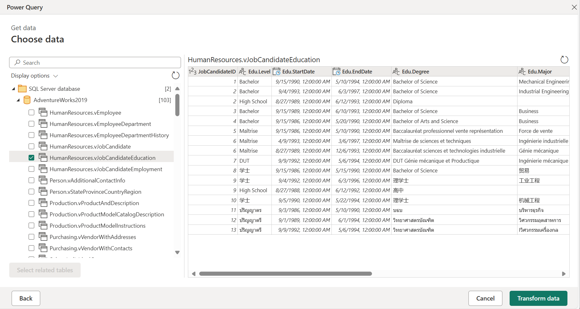 At this stage, you specify where to load the query. The options vary from integration to integration, but the one option that's always available is Transform data, which loads data to the Power Query editor to further transform and enrich the query.