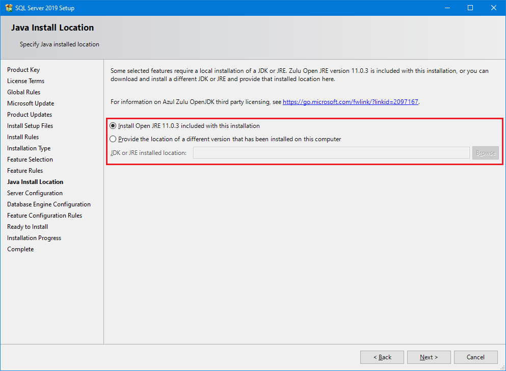 If you want to install the default Java runtime, select both Machine Learning Services and Language Extensions and Java.