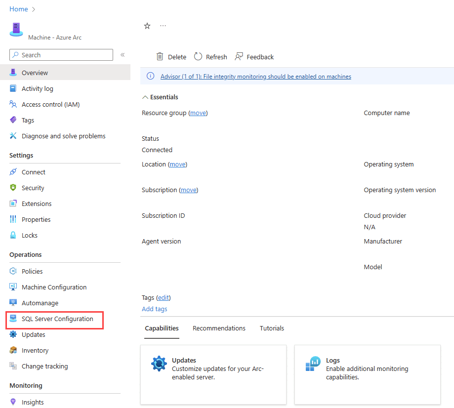 Open the Azure Arc-enabled SQL Server Overview pane, and then select Properties. Under SQL Server configuration, select the setting that you need to modify: