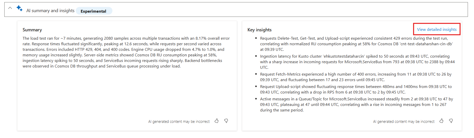 In this article, you learn how to use AI-powered actionable insights in Azure Load Testing to identify and troubleshoot performance issues in your application. This feature analyzes your test run data using AI to highlight key issues—such as latency spikes, throughput drops, or backend resource bottlenecks—and provides recommended next steps.