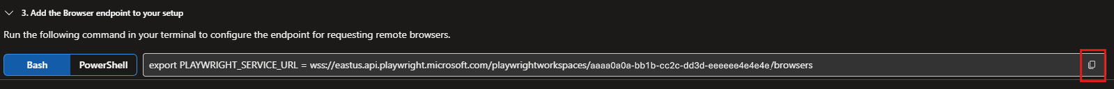 To set up your environment, you have to configure the PLAYWRIGHT_SERVICE_URL environment variable with the value you obtained in the previous steps.