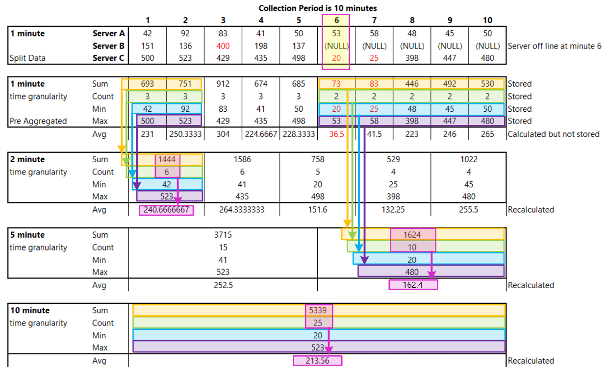 | Average | 73 / 2 | Always the Sum divided by the Count. It's never stored and always recalculated for each time granularity using the aggregated numbers for that granularity. Notice the recalculation for the 5-minute and 10-minute time granularities as highlighted above. |