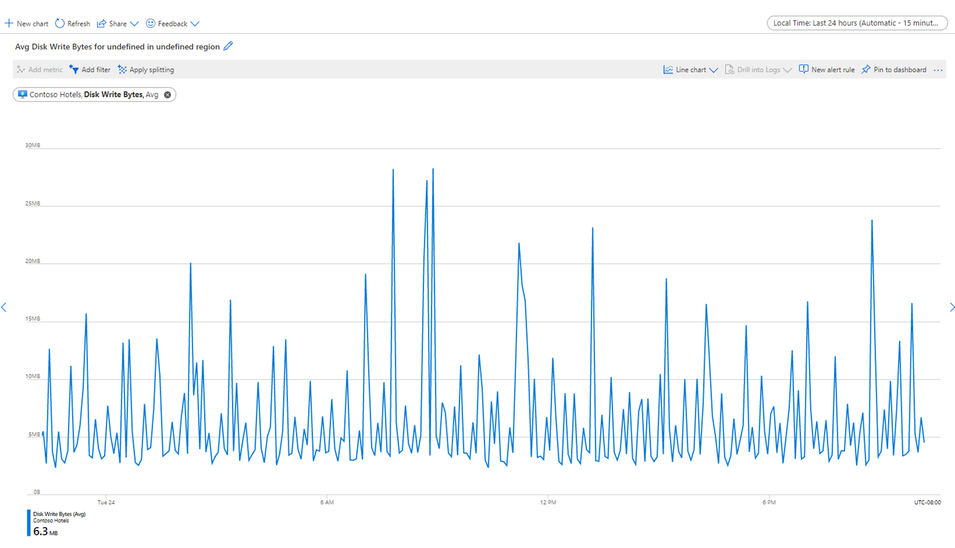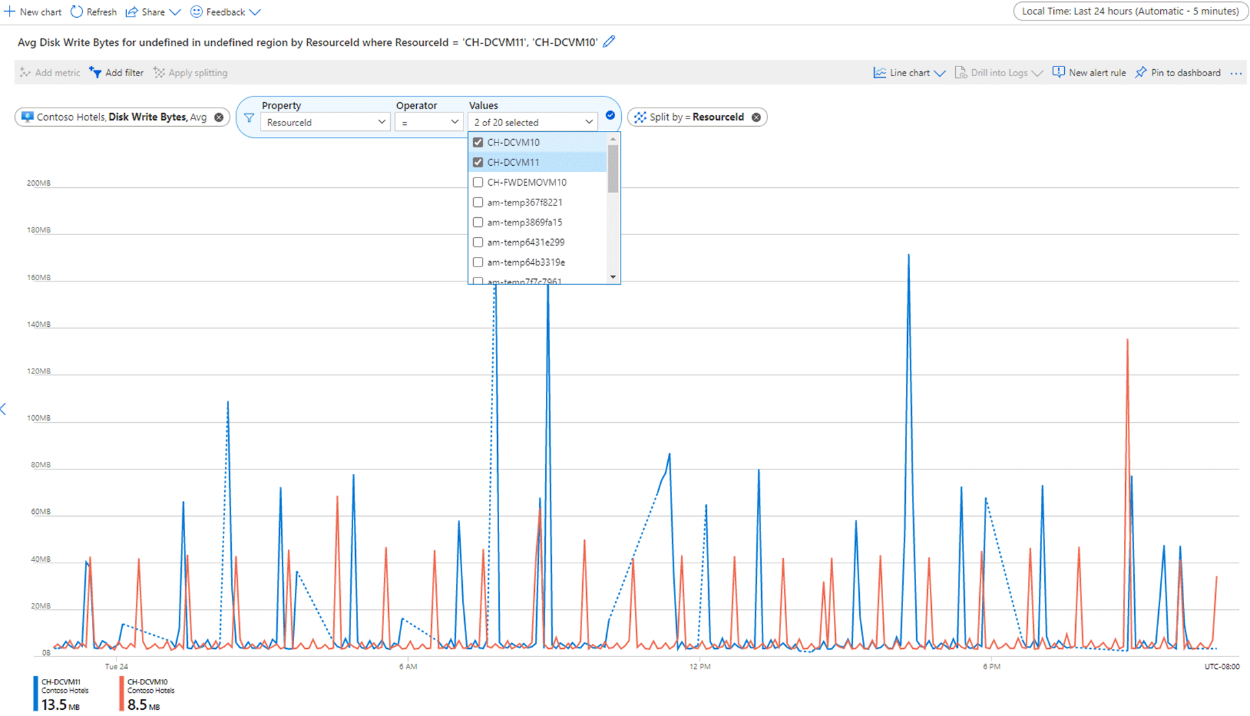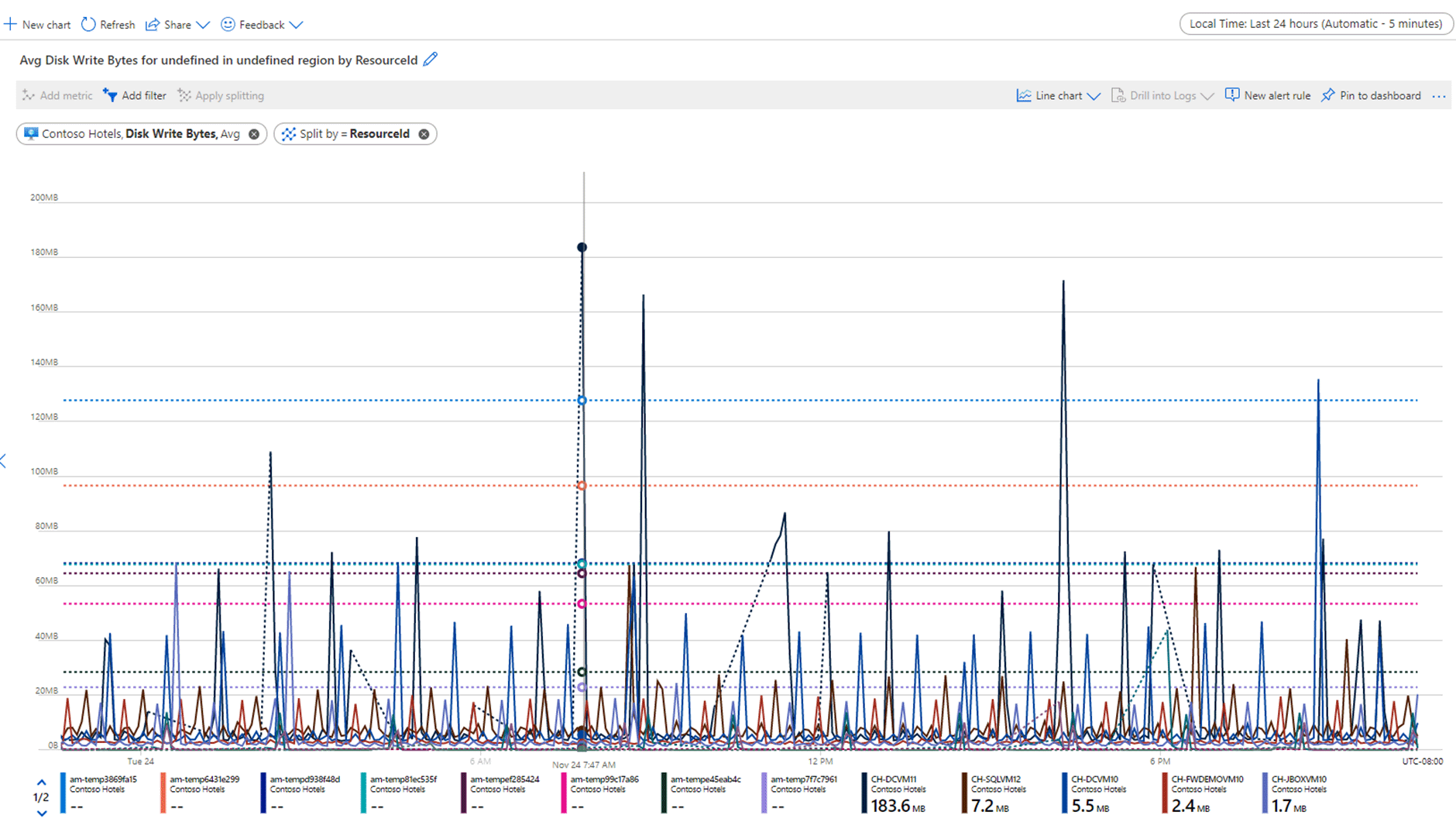 You can use splitting and filtering together to dig into a problem. Below is an example of a graphic showing the Avg Disk Write Bytes for a group of VMs in a resource group. We have a rollup of all the VMs with this metric, but we may want to dig into see which are responsible for the peaks around 6AM. Are they the same machine? How many machines are involved?