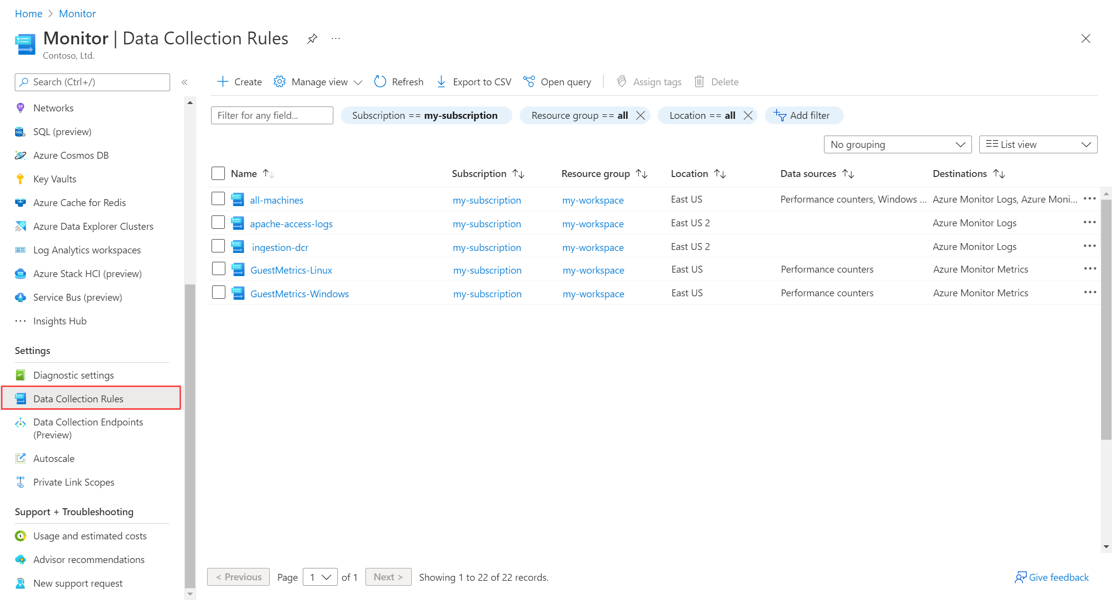 You can view the DCRs in your Azure subscription from Data Collection Rules on the Monitor menu in the Azure portal. DCRs support other data collection scenarios in Azure Monitor, so all of your DCRs aren't necessarily for virtual machines.