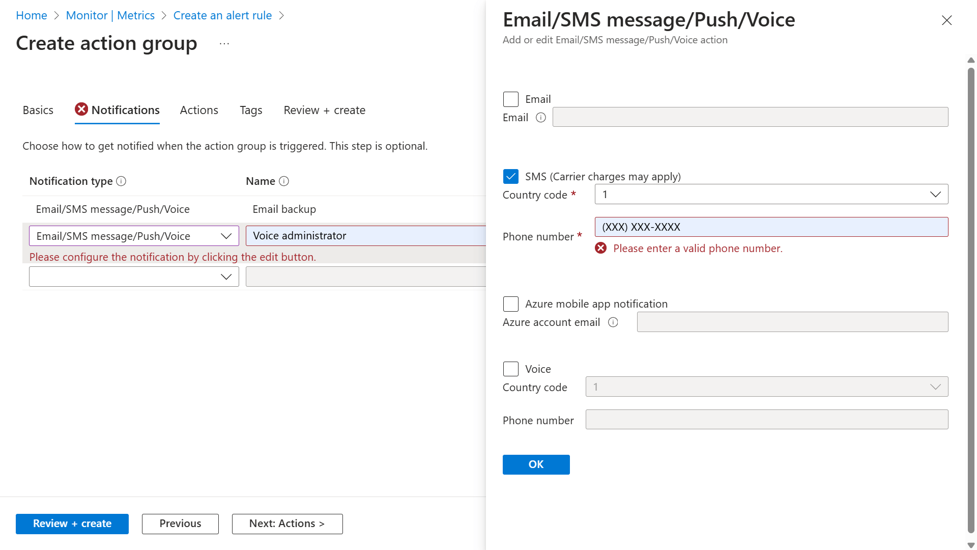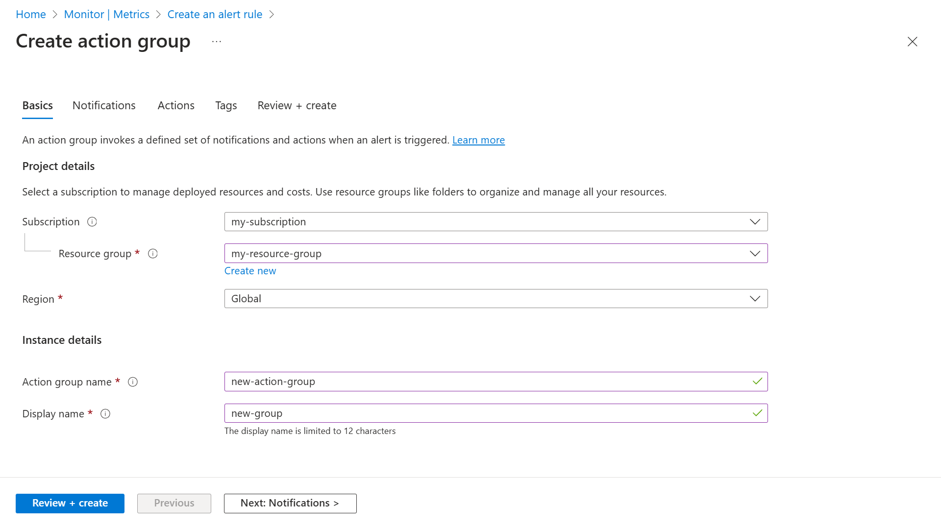 Select a Subscription and Resource group for the action group and give it an Action group name that appears in the portal and a Display name that appears in email and SMS notifications.