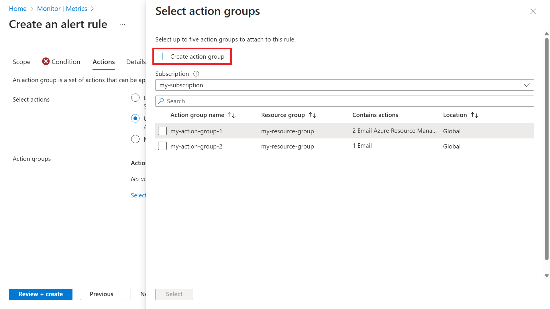 Select Create action group to create a new one.