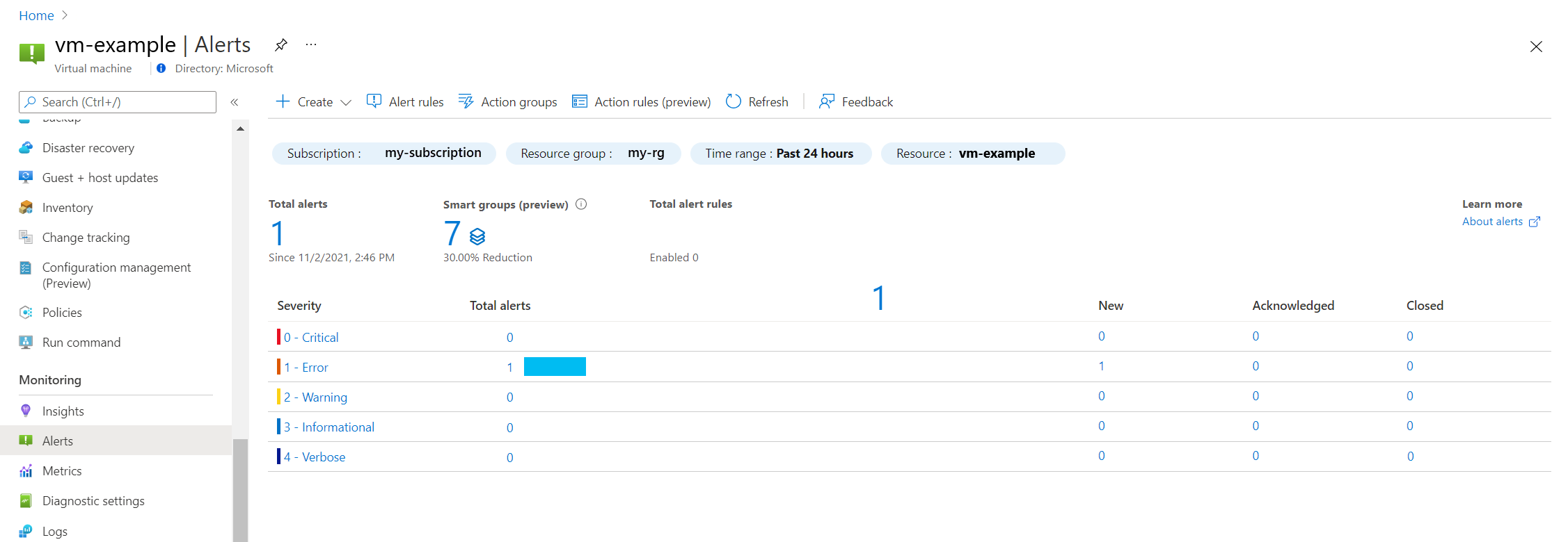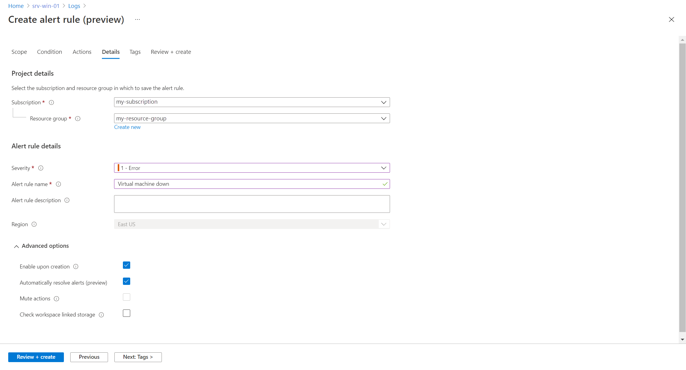 Setting Description Subscription Subscription where the alert rule is stored. Resource group Resource group where the alert rule is stored. This doesn't need to be in the same resource group as the resource that you're monitoring. Severity The severity allows you to group alerts with a similar relative importance. A severity of Error is appropriate for an unresponsive virtual machine. Alert rule name Name of the alert that shows when it fires. Alert rule description Optional description of the alert rule. Click Review + create to create the alert rule.
