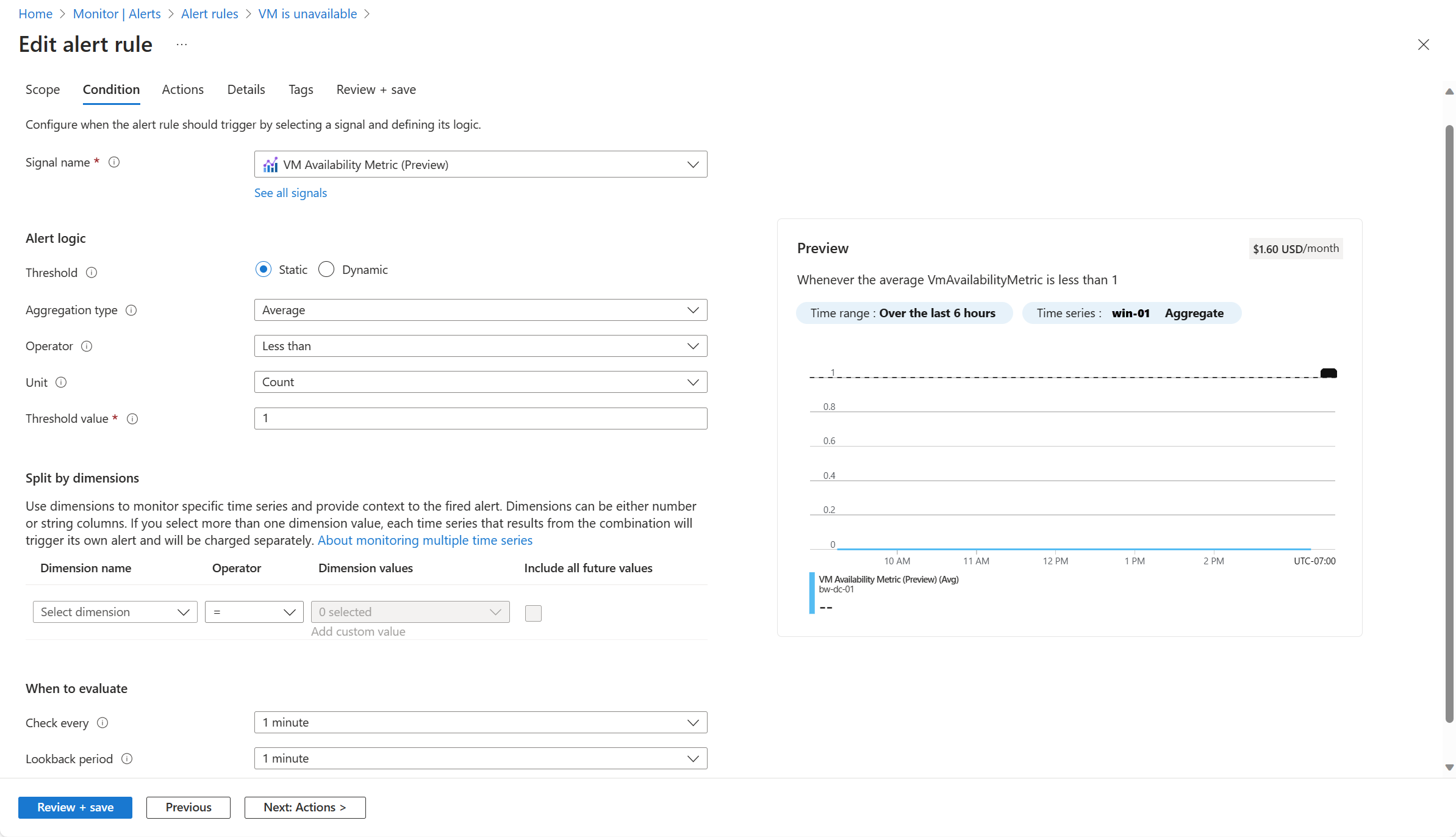 Set the following values for the Alert logic. This specifies that the alert fires whenever the average value of the availability metric falls below 1, which indicates that one of the VMs in the selected scope isn't running.