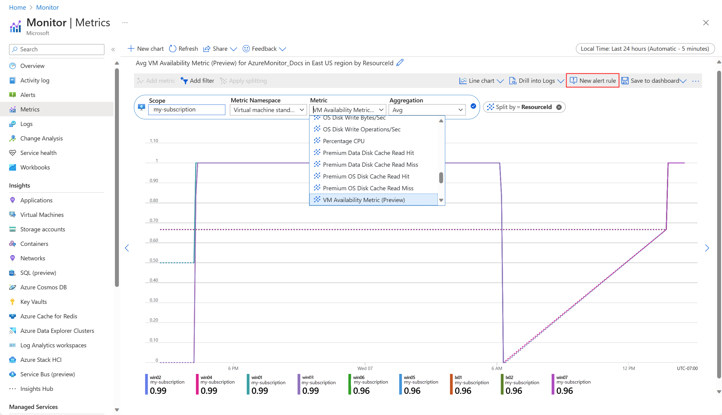 While this article uses the metric value VM Availability Metric, you can use the same process to alert on any metric value.