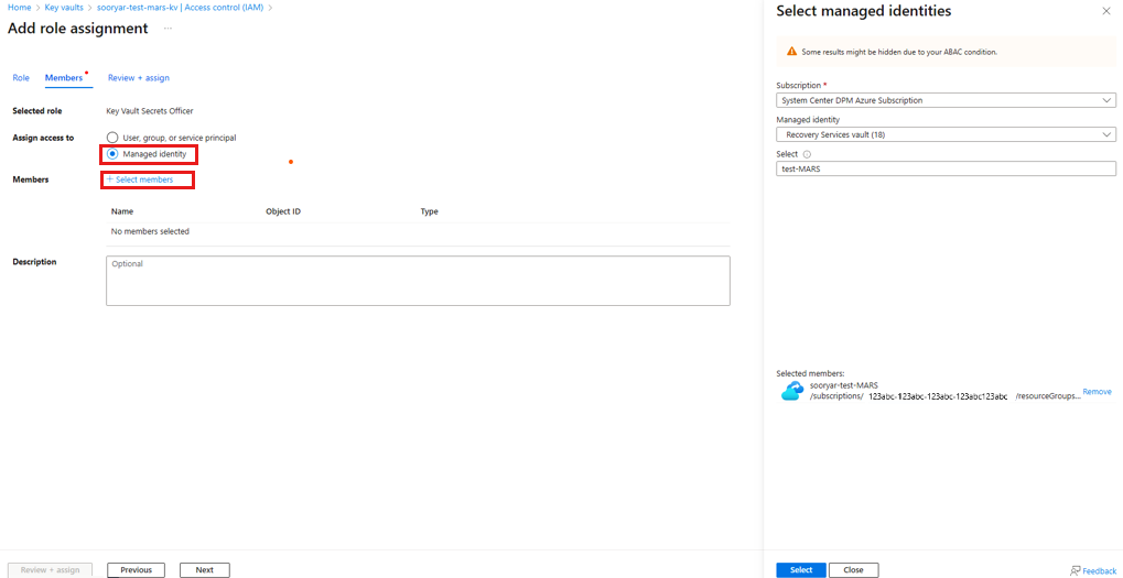 Select Managed identity and then + Select members. choose the Subscription of the target Recovery Services vault, select Recovery Services vault under System-assigned managed identity.