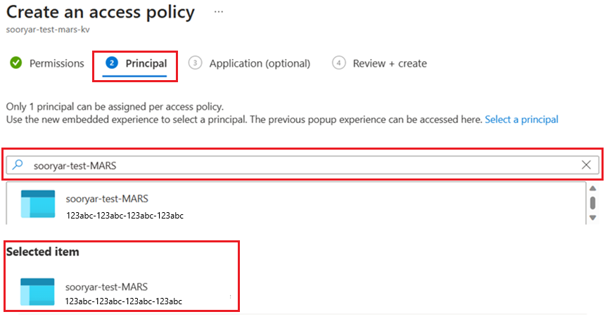 Go to Select Principal and search for your vault in the search box using its name or managed identity.