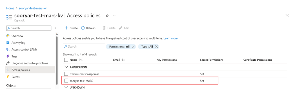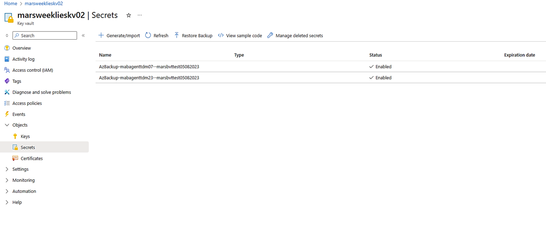 - Ensure that the Recovery Services vault name is listed under Key Vault -> Access policies -> Application, with Secret Permissions as Set.