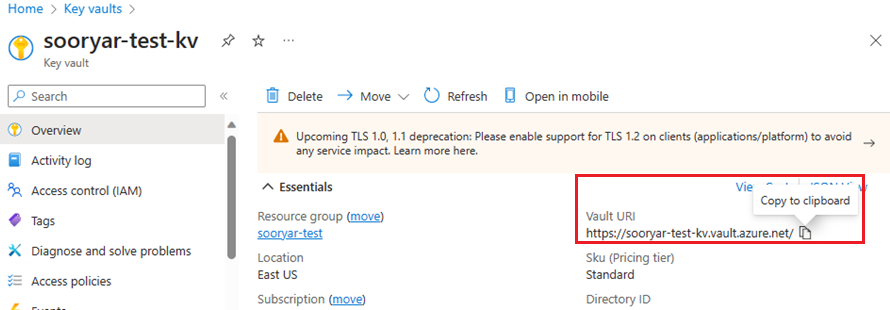 Open the Azure portal, open your Key Vault, and then copy the Key Vault URI.