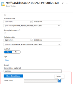 AzBackup-<machine name>-<vaultname>.Select the Secret, open the latest version, and copy the value of the Secret.