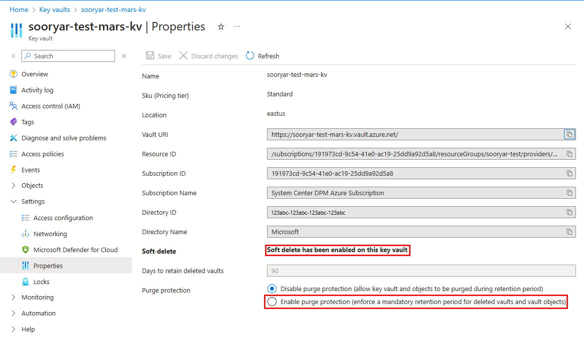 Alternatively, you can set these properties while creating the Key Vault. Learn more about these Key Vault properties.